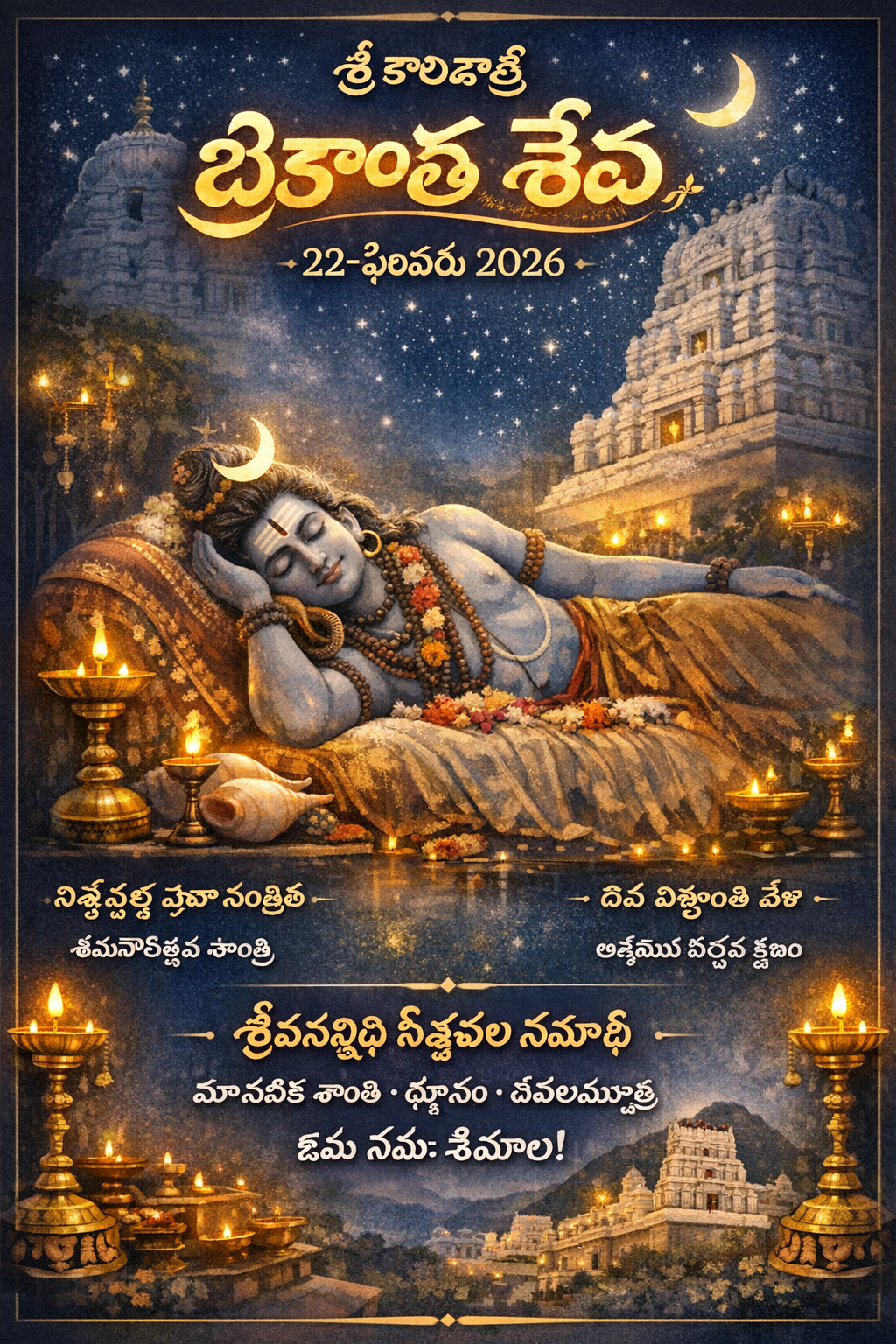 మహాశివరాత్రి ఉత్సవాల మరుసటి రోజు (22 ఫిబ్రవరి 2026) శ్రీకాళహస్తి ఆలయంలో రాత్రి సమయంలో జరిగే అత్యంత ప్రశాంతమైన మరియు పవిత్రమైన సేవ “ఏకాంత సేవ” (దీనినే పవళింపు సేవ అని కూడా అంటారు). ఈ సేవ గురించిన విశేషాలు మరియు చరిత్రను దశలవారీగా ఇక్కడ తెలుసుకుందాం: