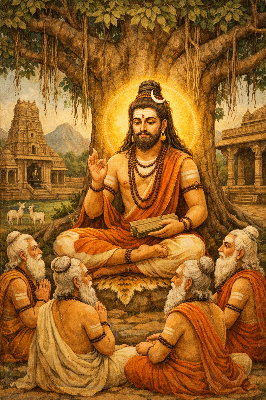 - Seated under a sacred Banyan Tree (Vata Vriksha)